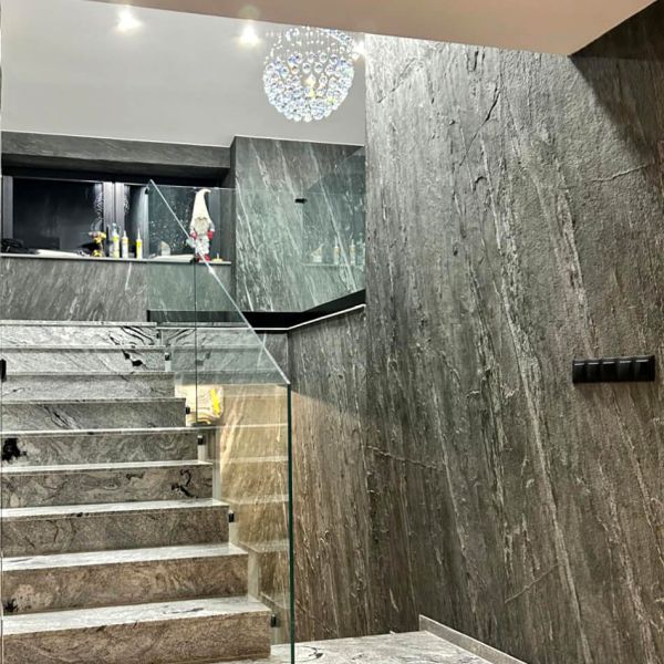 Naturalna powierzchnia i efektowna kolorystyka Tinos Green sprawiają, że każde pomieszczenie zyskuje wyjątkowy klimat, a zastosowanie dodatkowego oświetlenia może jeszcze bardziej podkreślić strukturę i grę kolorów kamienia.